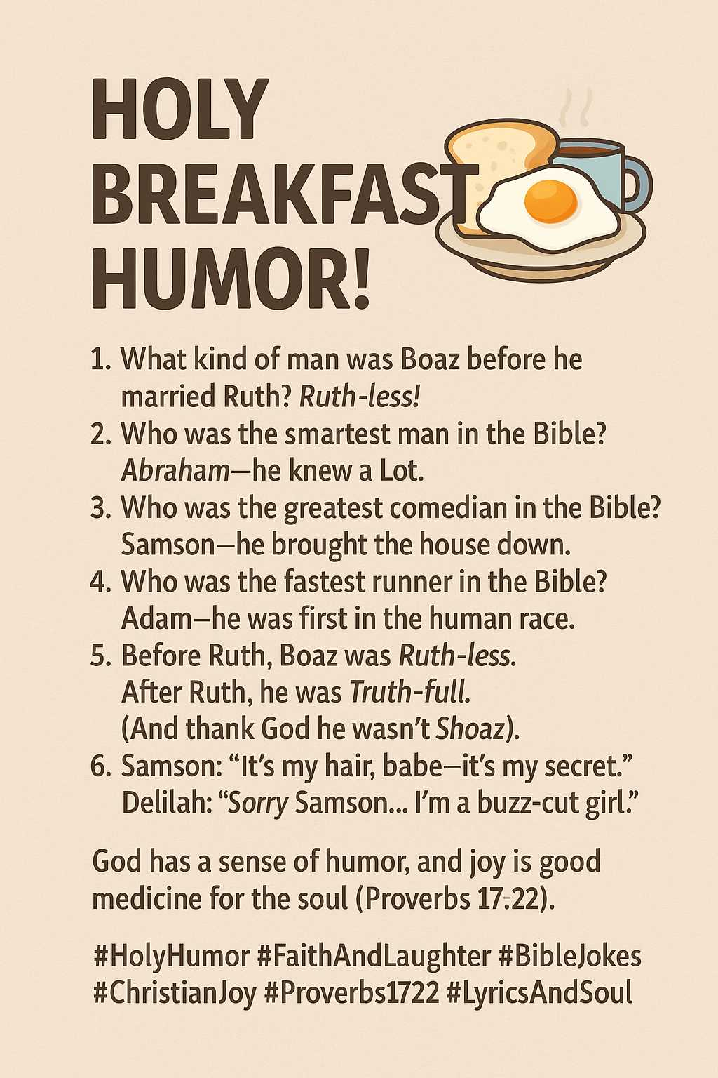 #HolyHumor #FaithAndLaughter #BibleJokes #ChristianJoy #Proverbs1722 #MorningBlessings #GodIsGood #RuthLessToTruthFull #SamsonStrength #iRiseForYou #LyricsAndSoul